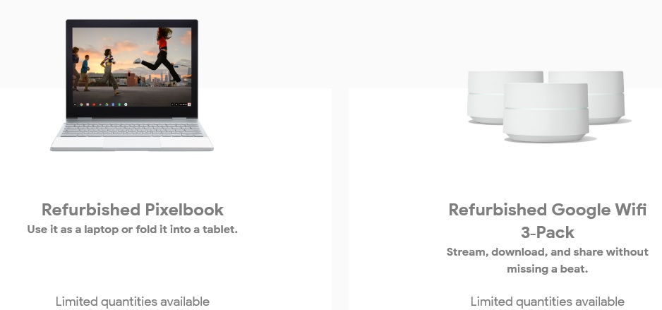 Наразі у розділі відремонтованих пристроїв Google лише два продукти: ноутбук Pixelbook та набір маршрутизаторів Google Wifi (3-Pack).
